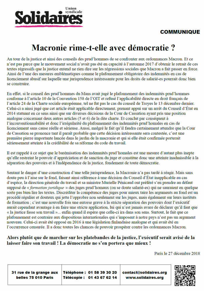 Sentant le danger d’une construction d’une telle jurisprudence, la Macronie n’a pas tardé à réagir. Mais sans doute peu à l’aise sur le fond, faisant ainsi référence à une décision du Conseil d’État inapplicable au cas d’espèce, la direction générale du travail et sa ministre Murielle Pénicaud ont préféré s’en prendre au défaut supposé de « formation juridique » des juges prud’homaux (on se doute salarié-es) qui ne sauraient en quelque sorte pas bien lire les textes. Discréditer la compétence des juges pour mieux taire les arguments au fond est un procédé régulier et douteux qui jette l’opprobre non seulement sur les juges, mais également sur leurs instituts de formation ; c’est une nouvelle fois une entorse grave à la stricte séparation des pouvoirs dont l’exécutif aurait cependant avantage à en faire une stricte application, lui qui n’est jamais avare de déclarer qu’il faut que « la justice fasse son travail »... enfin quand il espère que celle-ci ira dans son sens. Surtout, le fait que ce plafonnement est contraire aux dispositions internationales qui s’imposent à notre pays n’est pas un argument nouveau. Celui-ci avait été opposé en 2016 à une législation finlandaise analogue et qui avait été en l’occurrence censurée. Il a donc toutes les chances de pouvoir prospérer contre les ordonnances Macron.