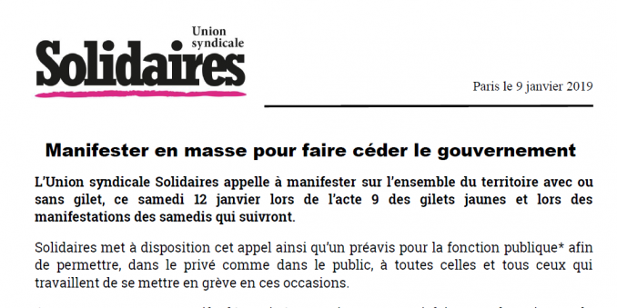 L’Union syndicale Solidaires appelle à manifester sur l’ensemble du territoire avec ou sans gilet, ce samedi 12 janvier lors de l’acte 9 des gilets jaunes et lors des manifestations des samedis qui suivront.