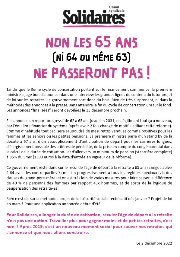 Pour Solidaires, allonger la durée de cotisation, reculer l’âge de départ à la retraite n’est pas une option. Travailler plus pour gagner moins et de petites retraites, c’est non ! Après 2019, c’est un nouveau moment social pour sauver nos retraites qui s’annonce et que nous allons construire.
