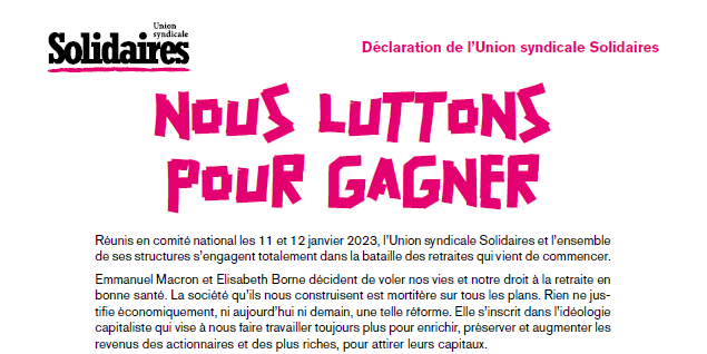Réunis en comité national les 11 et 12 janvier 2023, l’Union syndicale Solidaires et l’ensemble de ses structures s’engagent totalement dans la bataille des retraites qui vient de commencer.