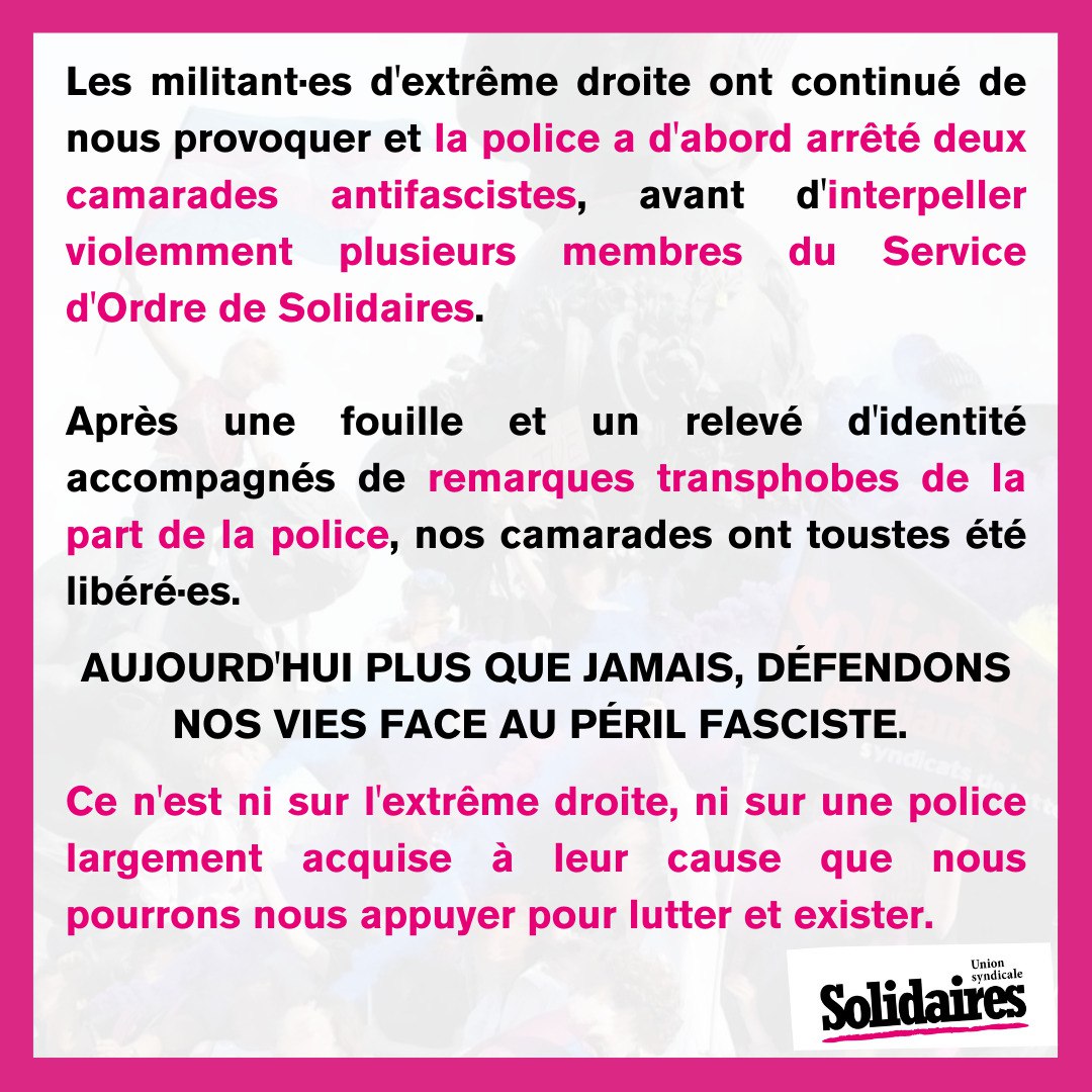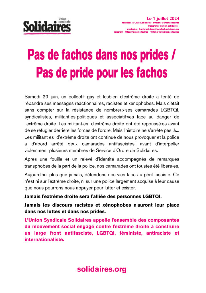 L’Union Syndicale Solidaires appelle l'ensemble des composantes du mouvement social engagé contre l'extrême droite à construire un large front antifasciste, LGBTQI, féministe, antiraciste et internationaliste.