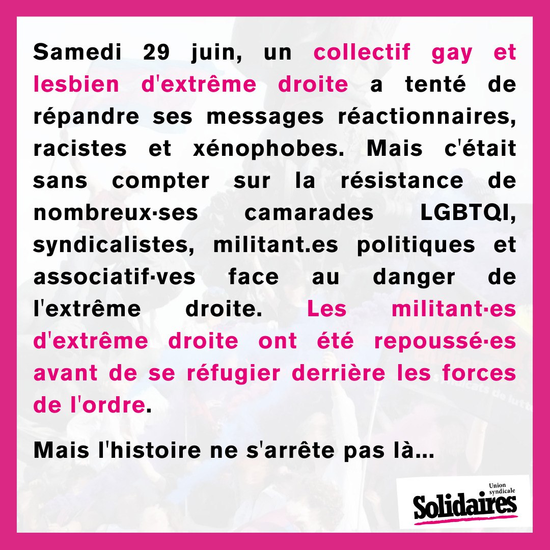 Samedi 29 juin, un collectif gay et lesbien d'extrême droite a tenté de répandre ses messages réactionnaires, racistes et xénophobes. Mais c'était sans compter sur la résistance de nombreux∙ses camarades LGBTQI, syndicalistes, militant×es politiques et associatif∙ves face au danger de l'extrême droite. Les militant×es d'extrême droite ont été repoussé·es avant de se réfugier derrière les forces de l'ordre. Mais l'histoire ne s'arrête pas là... Les militant×es d'extrême droite ont continué de nous provoquer et la police a d'abord arrêté deux camarades antifascistes, avant d'interpeller violemment plusieurs membres de Service d'Ordre de Solidaires.