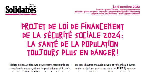Pour sortir de la logique austéritaire qui résulte des cadeaux faits au patronat qui creusent artificiellement les déficits de la sécurité sociale, Solidaires revendique l’arrêt des exonérations de cotisations sociales patronales (72 milliards d’euros) et la mise en place d’une cotisation sociale sur les dividendes affectée aux caisses de sécurité sociale. Enfin, il faut en finir avec l’austérité imposée par le gouvernement au travers de l’étatisation de la sécurité sociale. La gestion de la sécurité sociale doit revenir dans les mains des intéressé·es, - salarié·es élu·es et population - avec un vrai pouvoir de décision. Et pour un système de soins répondant aux besoins de la population et une véritable protection sociale, Solidaires appelle à se mobiliser massivement et à participer aux mobilisations du Tour de France pour la Santé.