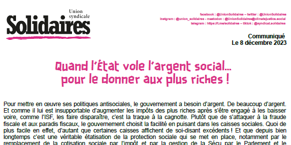 Les caisses de sécurité sociale et les organismes participant à la protection sociale ne sont pas la tirelire de l’État dans lequel celui-ci pourrait puiser pour financer ses politiques et son refus obstiné d'augmenter les impôts. Et ce n’est pas parce qu’il s’est installé maitre à bord des caisses sociales que cela l’autorise pour autant à disposer de ces fonds ! C’est en réalité à un nouveau « ruissellement » vers le haut auquel nous assistons : les cotisations sociales payées par les salarié-es servent de moins en moins à financer les politiques sociales et de redistribution et toujours plus à compenser les cadeaux fiscaux énormes faits aux plus riches. Cadeaux qui provoquent des déficits publics prétexte à la casse ensuite des services publics et des politiques sociales.