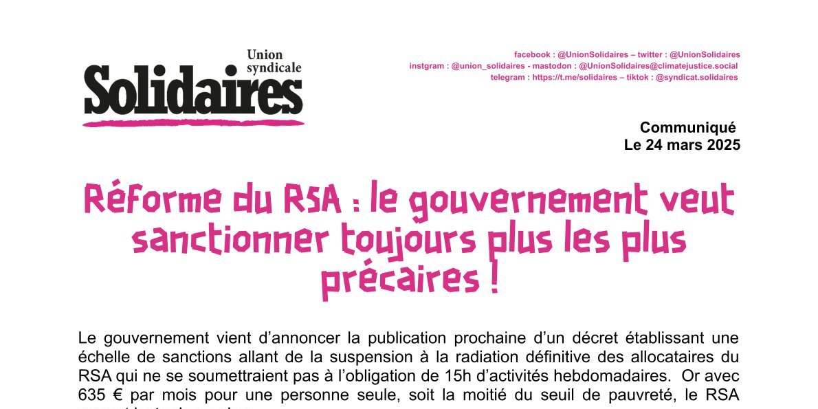Rappelons les 13 milliards de fraude sociale par an estimés par les pouvoirs publics contre lesquels rien n’est fait et dont plus de la moitié est l’oeuvre du patronat au travers du travail dissimulé. Sans parler des 100 milliards de fraude fiscale qui concernent essentiellement les classes sociales à hauts revenus. Outre les sanctions dont on peut craindre l’automaticité dès la moindre erreur histoire de réduire le nombre d’allocataires, cette politique de fermeté fera que les allocataires vont pour beaucoup renoncer au RSA pour ne pas avoir à subir le harcèlement de France Travail. Déjà que le tiers des allocations RSA n’est pas réclamé ! Autre effet : ce dispositif va tirer tout le monde vers le bas, les salarié-es devront ainsi modérer leurs revendications notamment salariales, ce qui stigmatisera encore plus les plus précaires.