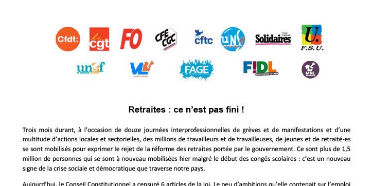 L’intersyndicale prend acte de ces décisions. Il revient donc aujourd’hui au Président de la République de prendre ses responsabilités. Devant le rejet massif de cette réforme, l’intersyndicale lui demande solennellement de ne pas promulguer la loi, seul moyen de calmer la colère qui s’exprime dans le pays.