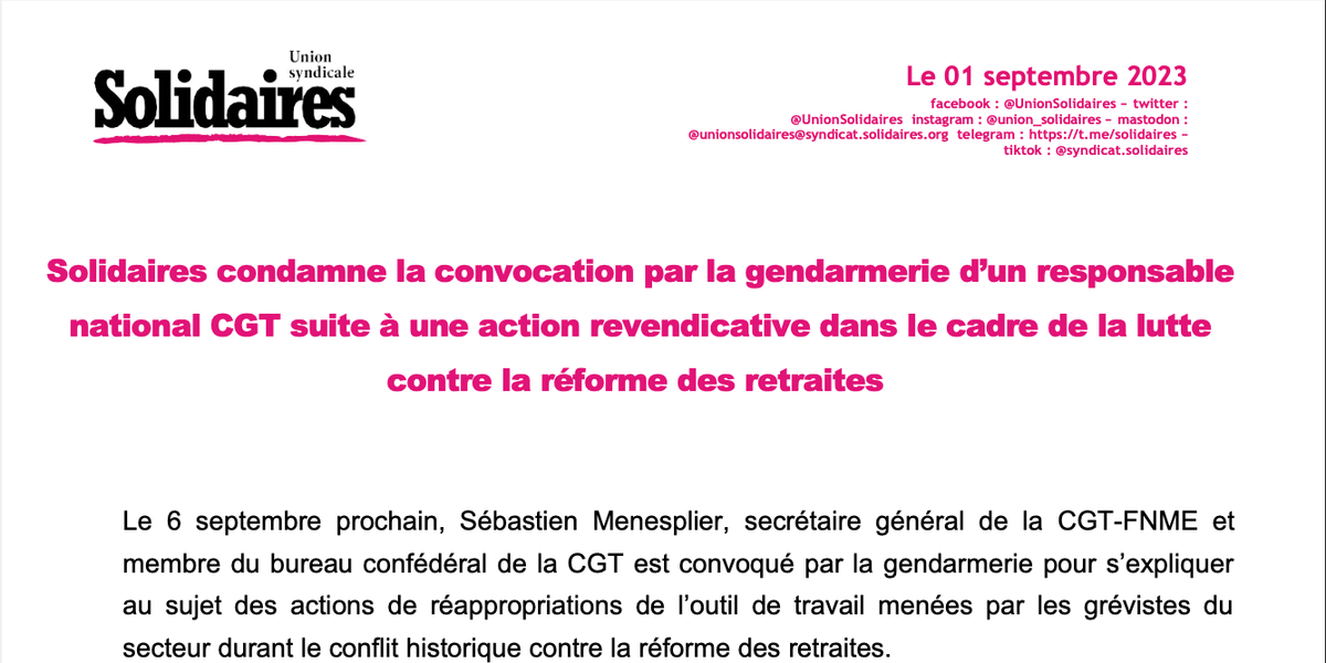 Solidaires condamne la convocation par la gendarmerie d’un responsable national CGT suite à une action revendicative dans le cadre de la lutte contre la réforme des retraites