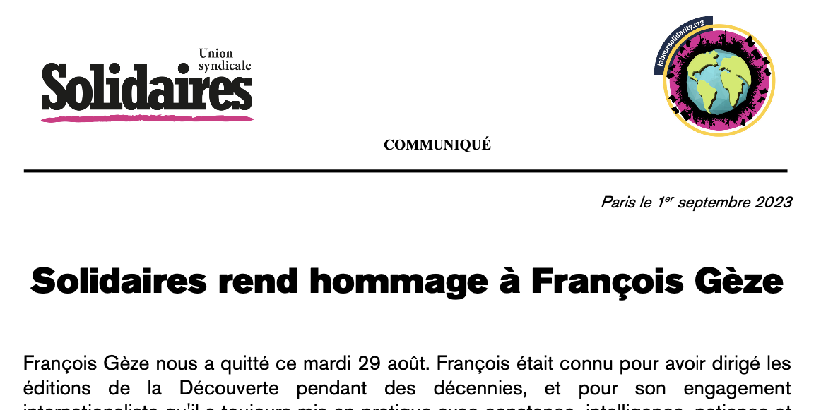 François Gèze nous a quitté ce mardi 29 août. François était connu pour avoir dirigé les éditions de la Découverte pendant des décennies, et pour son engagement internationaliste qu'il a toujours mis en pratique avec constance, intelligence, patience et détermination. Des camarades de l'Union syndicale Solidaires ont milité aux côtés de François Gèze dans la dénonciation de la dictature des généraux en Algérie qui dure depuis les années 90 et qui montre aujourd'hui encore sa véritable nature avec plus de 300 prisonnier·es politiques du Hirak, mouvement massif et populaire de dénonciation de la dictature à partir de 2019. Ces camarades avaient fondé en 2008, avec François et des camarades algérien·nes, le CISA, Comité International de Solidarité avec le Syndicalisme Autonome en Algérie. Pendant plusieurs années, le CISA, aux côtés de Solidaires, a dénoncé le harcèlement que subissaient les syndicalistes du Snapap puis de la Cgata du fait de leur indépendance vis-à-vis du pouvoir et parce qu'ils et elles demandent sans relâche la fin du régime contrôlé par l'armée en Algérie.