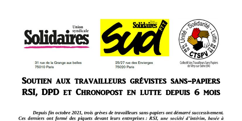 Soutien aux travailleurs grévistes sans-papiers RSI, DPD et Chronopost en lutte depuis 6 mois