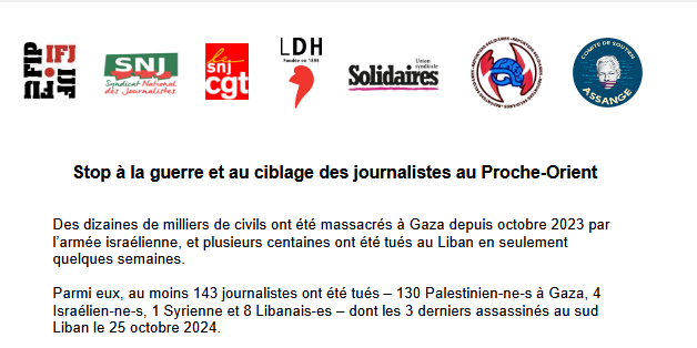 Parmi eux, au moins 143 journalistes ont été tués – 130 Palestinien-ne-s à Gaza, 4 Israélien-ne-s, 1 Syrienne et 8 Libanais-es – dont les 3 derniers assassinés au sud Liban le 25 octobre 2024.
