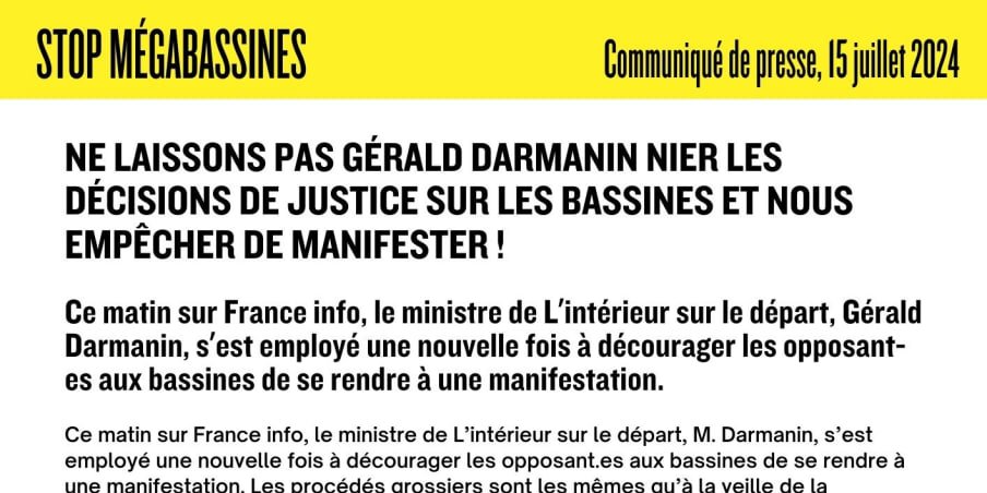 Ce matin du 15 juillet 2024 sur France info, le ministre de L’intérieur sur le départ, M. Darmanin, s’est employé une nouvelle fois à décourager les opposant.es aux bassines de se rendre à une manifestation.