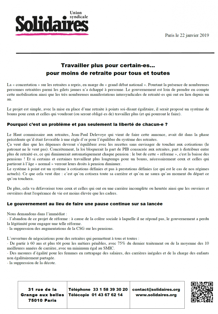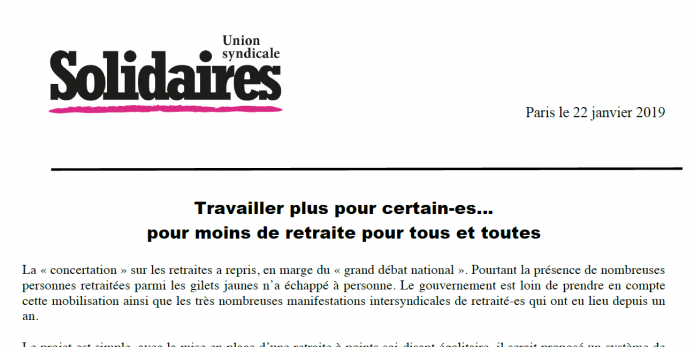 La « concertation » sur les retraites a repris, en marge du « grand débat national ». Pourtant la présence de nombreuses personnes retraitées parmi les gilets jaunes n’a échappé à personne. Le gouvernement est loin de prendre en compte cette mobilisation ainsi que les très nombreuses manifestations intersyndicales de retraité-es qui ont eu lieu depuis un an.