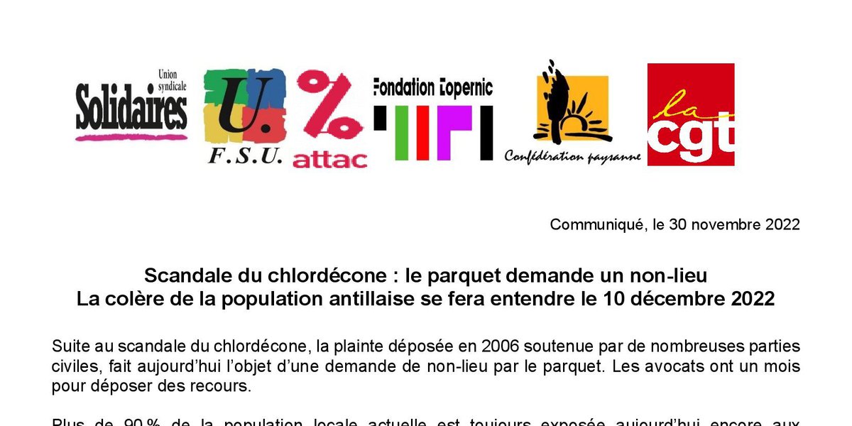 En soutien aux Antilles, nos organisations : la Fédération Syndicale Unitaire, la Fondation Copernic, la Confédération paysanne, ATTAC France, la Confédération Générale du Travail et l’Union syndicale Solidaires ont sollicité par courriel une audience le 25 mai 2022 auprès des Ministres de l’Outre-mer et de la Justice. Cette demande a été réitérée par nos soins le 21 juin 2022 en y incluant la Ministre de la Santé et de la Prévention. Ces deux demandes d’audience sont restées sans réponse de leur part. Cela en dit long sur le peu de considération qu’ils accordent à la population des Antilles. Le traitement infligé aux antillais-es est une insulte à la souffrance physique et morale qu’elles et ils supportent depuis des décennies.