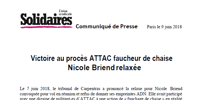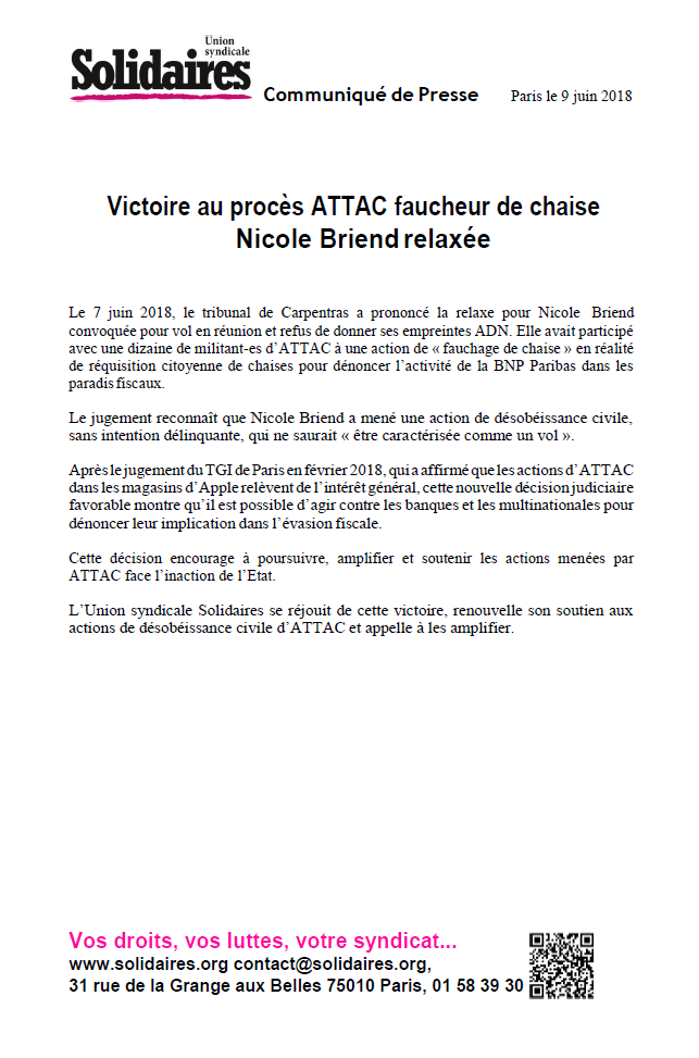 Le 7 juin 2018, le tribunal de Carpentras a prononcé la relaxe pour Nicole Briend convoquée pour vol en réunion et refus de donner ses empreintes ADN. Elle avait participé avec une dizaine de militant-es d’ATTAC à une action de « fauchage de chaise » en réalité de réquisition citoyenne de chaises pour dénoncer l’activité de la BNP Paribas dans les paradis fiscaux.