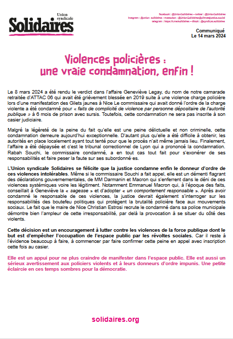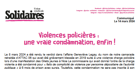 Le 8 mars 2024 a été rendu le verdict dans l’affaire Geneviève Legay, du nom de notre camarade retraitée d’ATTAC 06 qui avait été griévement blessée en 2019 suite à une violente charge policière lors d’une manifestation des Gilets jaunes à Nice. Le commissaire qui avait donné l’ordre de la charge violente a été condamné pour « faits de complicité de violence par personne dépositaire de l'autorité publique » à 6 mois de prison avec sursis. Toutefois, cette condamnation ne sera pas inscrite à son casier judiciaire.