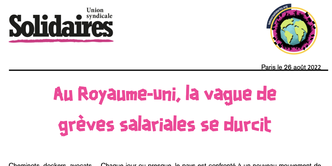 L’Union syndicale Solidaires apporte son soutien à ces mobilisations. La question salariale et du partage des richesses est centrale dans la période, en France aussi, c’est pourquoi nous appelons à une grève et une mobilisation d’ampleur à construire dans la durée dès le 29 septembre.