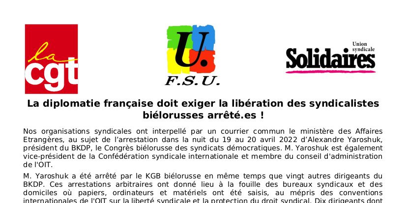 (CGT-FSU-Solidaires) La diplomatie française doit exiger la libération des syndicalistes biélorusses arrêté.es !