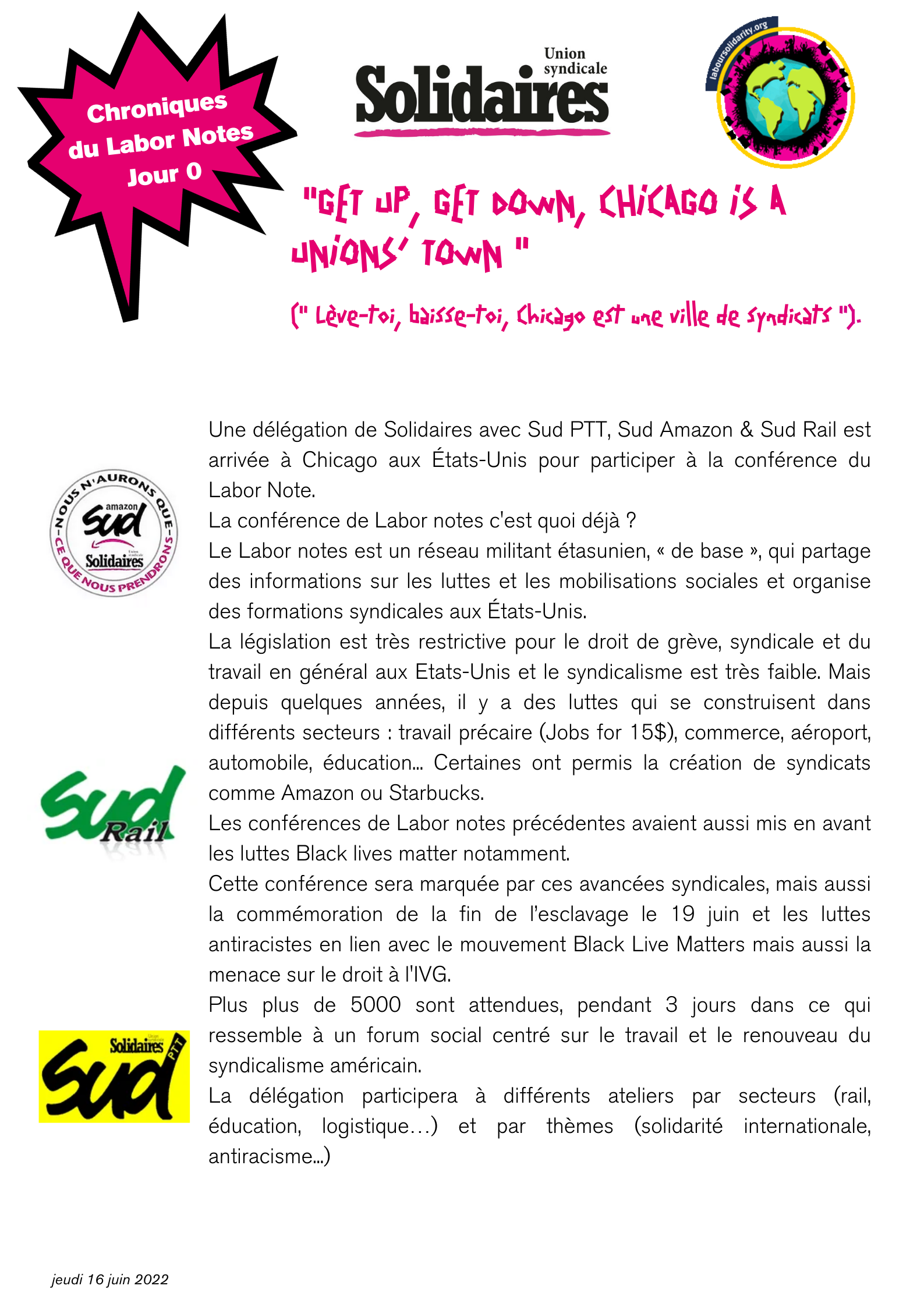 Une délégation de Solidaires avec Sud PTT, Sud Amazon & Sud Rail est arrivée à Chicago aux États-Unis pour participer à la conférence du Labor Note.