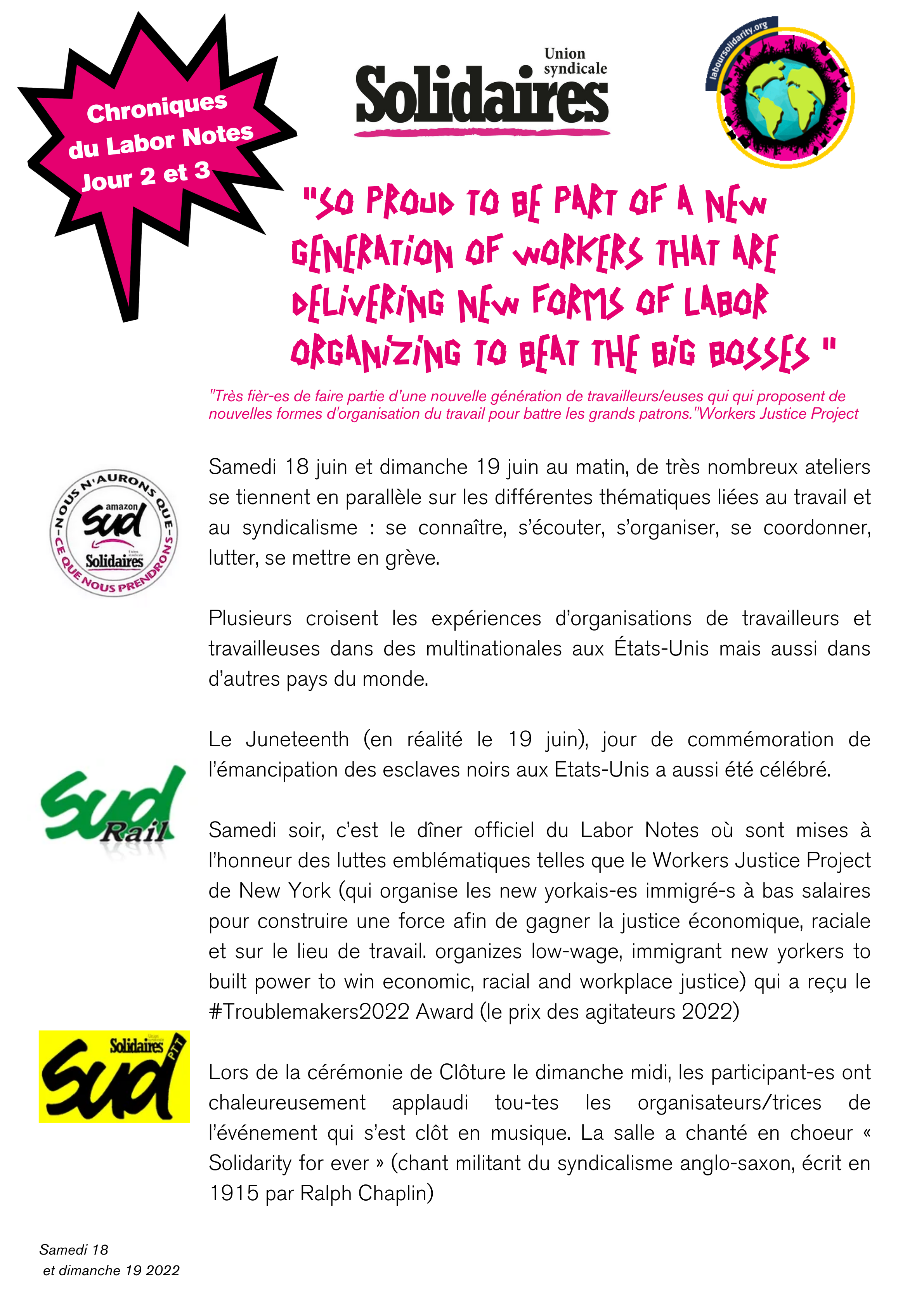 Chronique de la conférence de Labor Notes - J2 et J3 : So proud to be part of a new generation of workers that are delivering new forms of labor organizing to beat the Big Bosses