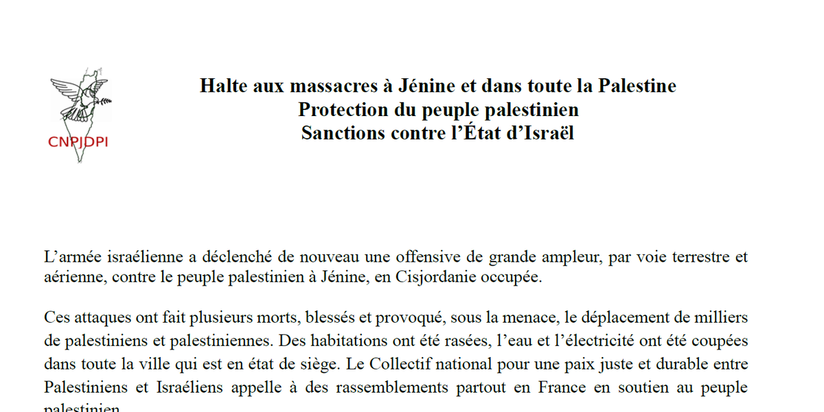 Membres du Collectif National pour une Paix Juste et Durable entre Palestiniens et Israéliens signataires de l’appel : Agir Contre le Colonialisme Aujourd’hui (ACCA) – AFD International – AILES Femmes du Maroc - Alternative Libertaire (AL) - Américains contre la guerre (AAW) - Association des Travailleurs Maghrébins de France (ATMF) - Association des Tunisiens en France (ATF) - Association France Palestine Solidarité (AFPS) - Association Nationale des Elus Communistes et Républicains (ANECR) - Association pour la Taxation des Transactions financières et pour l’Action Citoyenne (ATTAC) - Association pour les Jumelages entre les camps de réfugiés Palestiniens et les villes Françaises (AJPF) - Association Républicaine des Anciens Combattants (ARAC) - Association Universitaire pour le Respect du Droit International en Palestine (AURDIP) - Cedetim / IPAM - Collectif des Musulmans de France (CMF) - Collectif Faty Koumba : Association des Libertés, Droits de l'Homme et non-violence - Collectif Judéo-Arabe et Citoyen pour la Palestine (CJACP) - Collectif Paix Palestine Israël (CPPI Saint-Denis) - Comité de Vigilance pour une Paix Réelle au Proche-Orient (CVPR PO) - Comité Justice et Paix en Palestine et au Proche-Orient du 5e arrt (CJPP5) - Confédération générale du Travail (CGT) - Droit- Solidarité – Ensemble! Mouvement pour une alternative de gauche écologiste et solidaire - Europe Ecologie les Verts (EELV) – Fédération des Tunisiens pour une Citoyenneté des deux Rives (FTCR) – Fédération Syndicale Unitaire (FSU) - Forum Palestine Citoyenneté - Génération Palestine –La Courneuve-Palestine – La France Insoumise (LFI) - le Mouvement de la Paix - les Femmes en noir (FEN) - Ligue Internationale des Femmes pour la Paix et la Liberté, section française de la Women’s International League for Peace and Freedom (WILPF) (LIFPL) - Mouvement contre le Racisme et pour l’Amitié entre les Peuples (MRAP) - Mouvement Jeunes Communistes de France (MJCF) – Nouveau Parti Anticapitaliste (NPA) - Organisation de Femmes Egalité - Parti Communiste des Ouvriers de France (PCOF) - Parti Communiste Français (PCF) - Parti de Gauche (PG) - Participation et Spiritualité Musulmanes (PSM) – Sortir du colonialisme - Une Autre Voix Juive (UAVJ) - Union des Travailleurs Immigrés Tunisiens (UTIT) – Union Juive Française pour la Paix (UJFP) -Union Nationale des Etudiants de France (UNEF) - Union syndicale Solidaires