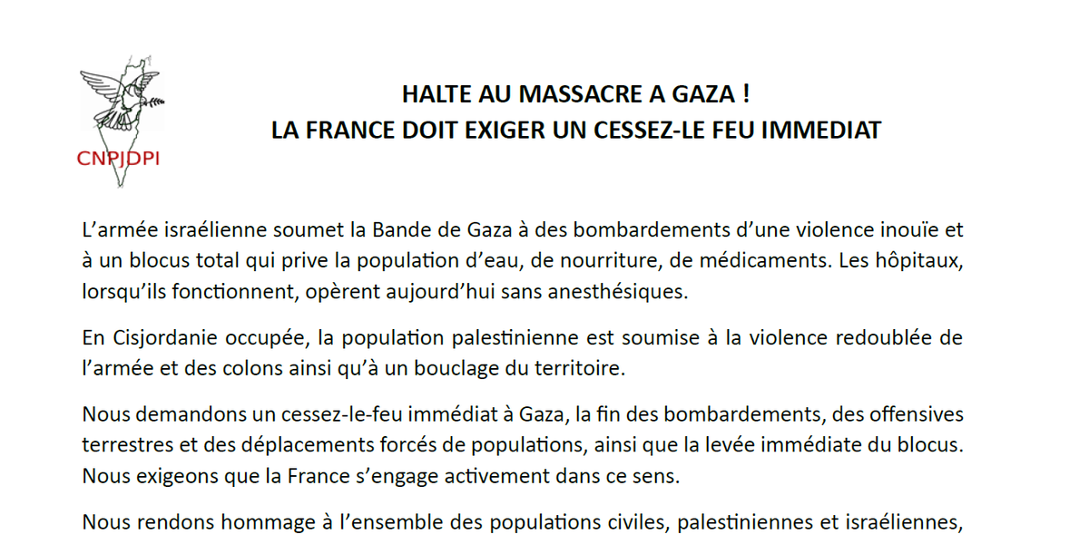 Collectif National pour une Paix Juste et Durable entre Palestiniens et Israéliens - Appel à manifestations partout en France le week-end des 11/12 novembre 2023.