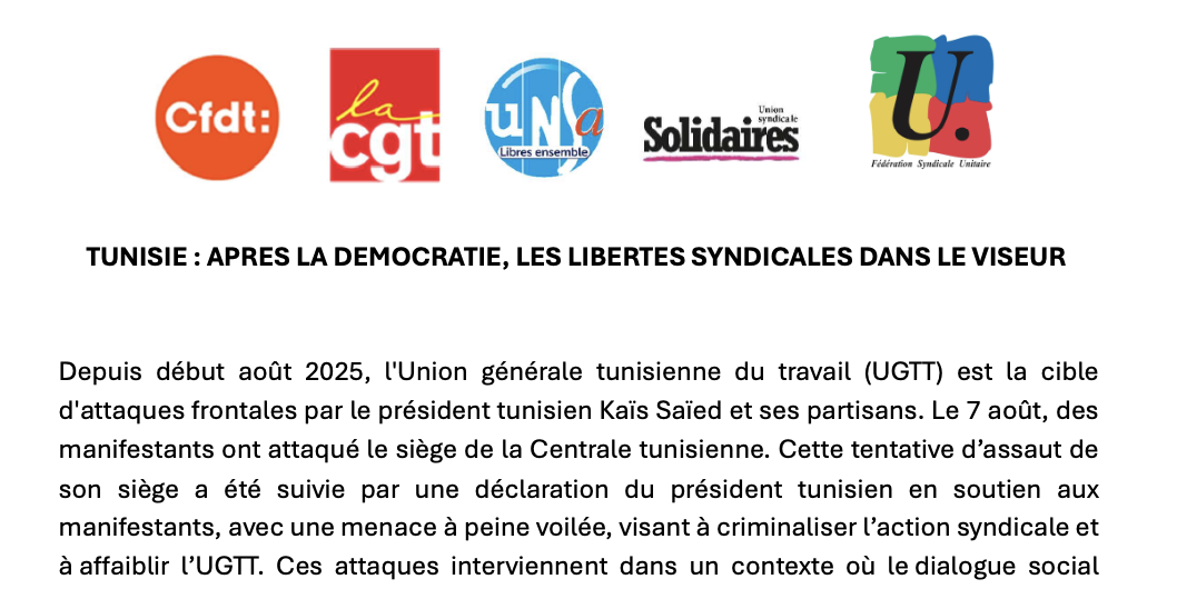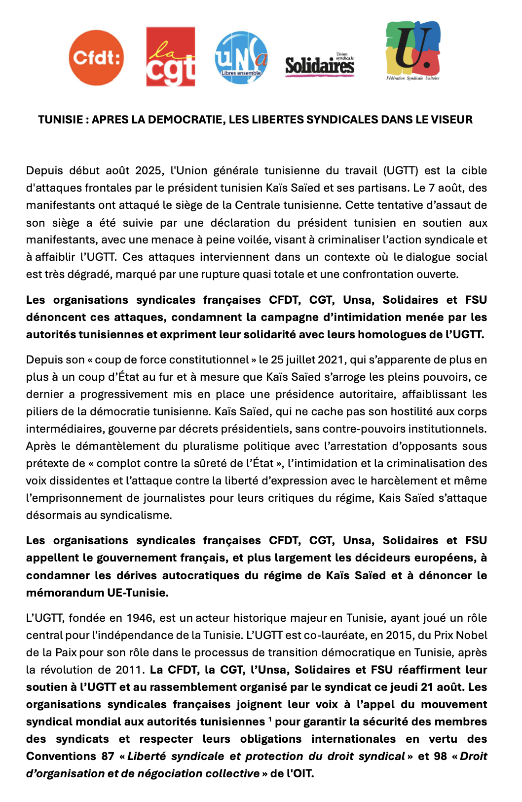 Les organisations syndicales françaises CFDT, CGT, Unsa, Solidaires et FSU dénoncent ces attaques, condamnent la campagne d’intimidation menée par les autorités tunisiennes et expriment leur solidarité avec leurs homologues de l’UGTT.
