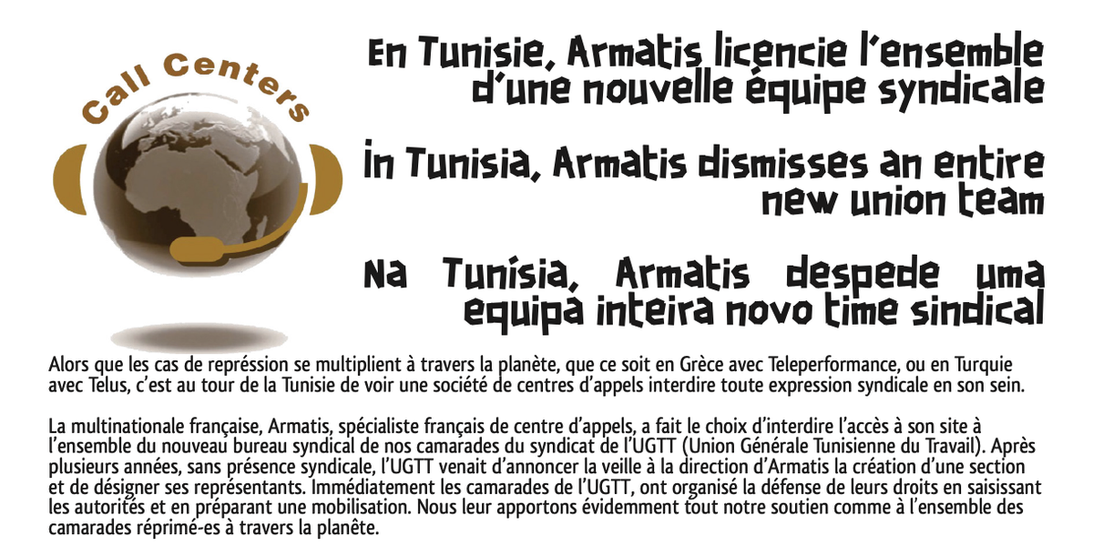 La multinationale française, Armatis, spécialiste français de centre d’appels, a fait le choix d’interdire l’accès à son site à l’ensemble du nouveau bureau syndical de nos camarades du syndicat de l’UGTT (Union Générale Tunisienne du Travail). Après plusieurs années, sans présence syndicale, l’UGTT venait d’annoncer la veille à la direction d’Armatis la création d’une section et de désigner ses représentants. Immédiatement les camarades de l’UGTT, ont organisé la défense de leurs droits en saisissant les autorités et en préparant une mobilisation. Nous leur apportons évidemment tout notre soutien comme à l’ensemble des camarades réprimé-es à travers la planête.