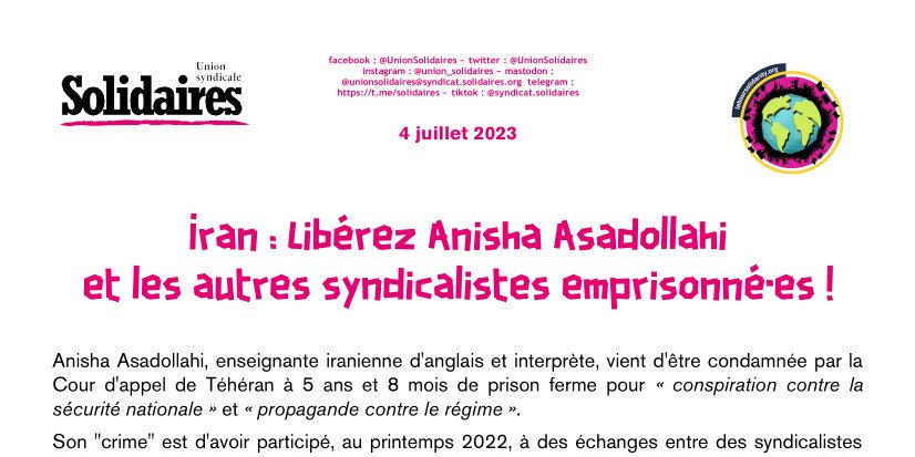 - la libération immédiate d'Anisha Asadollahi et des autres syndicalistes emprisonné·es,