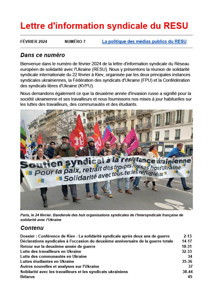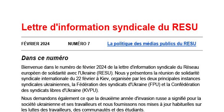 Dans ce numéro de février 2024 de la lettre d'information syndicale du Réseau européen de solidarité avec l'Ukraine (RESU), nous y présentons la réunion de solidarité syndicale internationale du 22 février à Kiev, organisée par les deux principales instances syndicales ukrainiennes, la Fédération des syndicats d'Ukraine (FPU) et la Confédération des syndicats libres d'Ukraine (KVPU). Nous demandons également ce que la deuxième année d'invasion russe a signifié pour la société ukrainienne et ses travailleurs et nous fournissons nos mises à jour habituelles sur les luttes des travailleurs, des communautés et des étudiants.