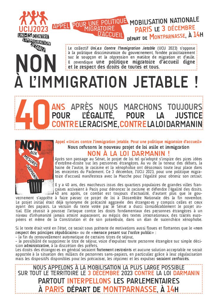 Non à l'immigration jetable ! 40 ans après nous marchons toujours pour l'égalité, la justice, contre le racisme, contre la loi Darmanin ! Mobilisation le 3 décembre !