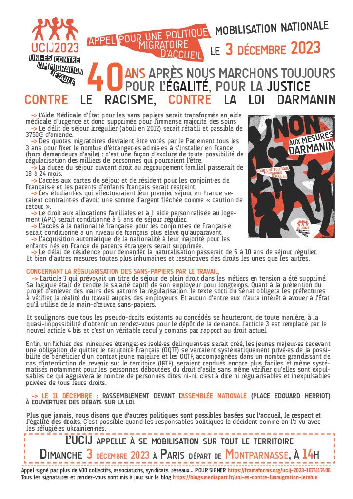 L'UCIJ appelle à se mobiliser partout en France contre le projet de loi Darmanin le dimanche 3 décembre avec la Marche pour l'Égalité (à Paris le rendez vous pour le départ de la manifestation aura lieu à Montparnasse à partir de  14h00).
