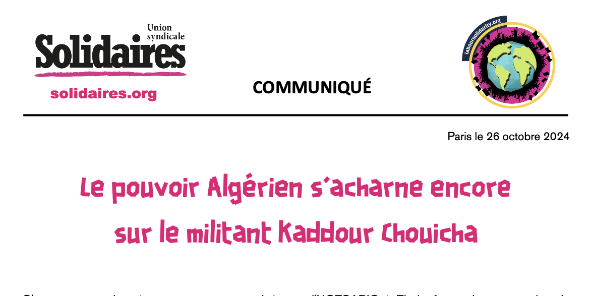 C'est en se rendant à une rencontre organisée par l'UGTSARIO à Tindouf que des camarades de Solidaires ont appris que Kaddour Chouicha, Coordonateur national du SESS (Syndicat des Enseignant·es du Supérieur Solidaires) et membre actif de la LADDH (Ligue Algérienne de Défense des Droits Humains) dissoute par le pouvoir, devait à nouveau comparaître devant un tribunal d'Oran ce dimanche 27 octobre, après une première convocation le 20. Les convocation et reports font partie de la stratégie de harcèlement judiciaire et d'épuisement des militant·es.