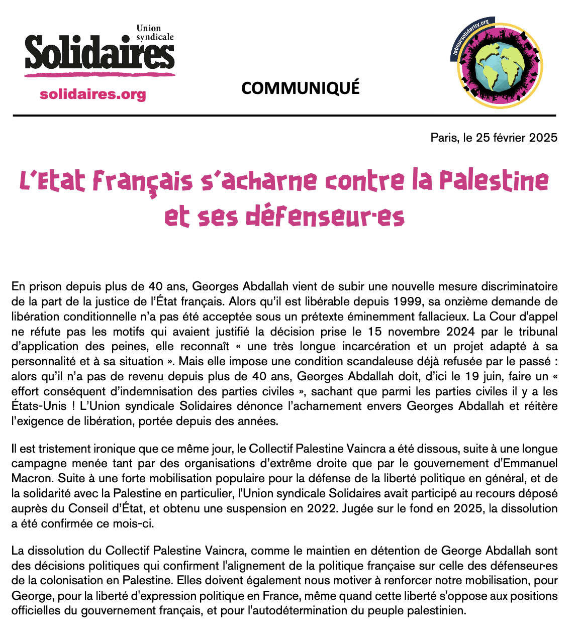 En prison depuis plus de 40 ans, Georges Abdallah vient de subir une nouvelle mesure discriminatoire de la part de la justice de l’État français. Alors qu’il est libérable depuis 1999, sa onzième demande de libération conditionnelle n’a pas été acceptée sous un prétexte éminemment fallacieux. La Cour d'appel ne réfute pas les motifs qui avaient justifié la décision prise le 15 novembre 2024 par le tribunal d’application des peines, elle reconnaît « une très longue incarcération et un projet adapté à sa personnalité et à sa situation ». Mais elle impose une condition scandaleuse déjà refusée par le passé : alors qu’il n’a pas de revenu depuis plus de 40 ans, Georges Abdallah doit, d’ici le 19 juin, faire un « effort conséquent d’indemnisation des parties civiles », sachant que parmi les parties civiles il y a les États-Unis ! L’Union syndicale Solidaires dénonce l’acharnement envers Georges Abdallah et réitère l’exigence de libération, portée depuis des années.