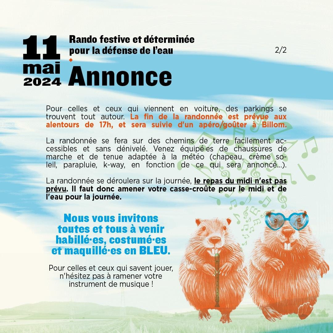 La randonnée se fera sur des chemins de terre facilement accessibles et sans dénivelé. Venez équipé·es de chaussures de marche et de tenue adaptée à la météo. La randonnée se déroulera sur la journée, le repas du midi n'est pas prévu. Il faut donc amener votre casse-croûte pour le midi et de l'eau pour la journée. Vous l'aurez compris, cette randonnée se veut artistique et festive, et pour l'occasion nous vous invitons toutes et tous à venir habillé·es, costumé.es et maquillé·es en BLEU Pour celles et ceux qui savent jouer, n'hésitez pas à ramener votre instrument de musique ! Un arrêté préfectoral interdit le port de toute arme (inclus les armes par destination) du 6 au 12 mai dans l'Est du département du Puy-de-Dôme (donc pensez à laisser le couteau de votre grand-père à la maison). Coordonnées GPS : 45.78445,3.287843