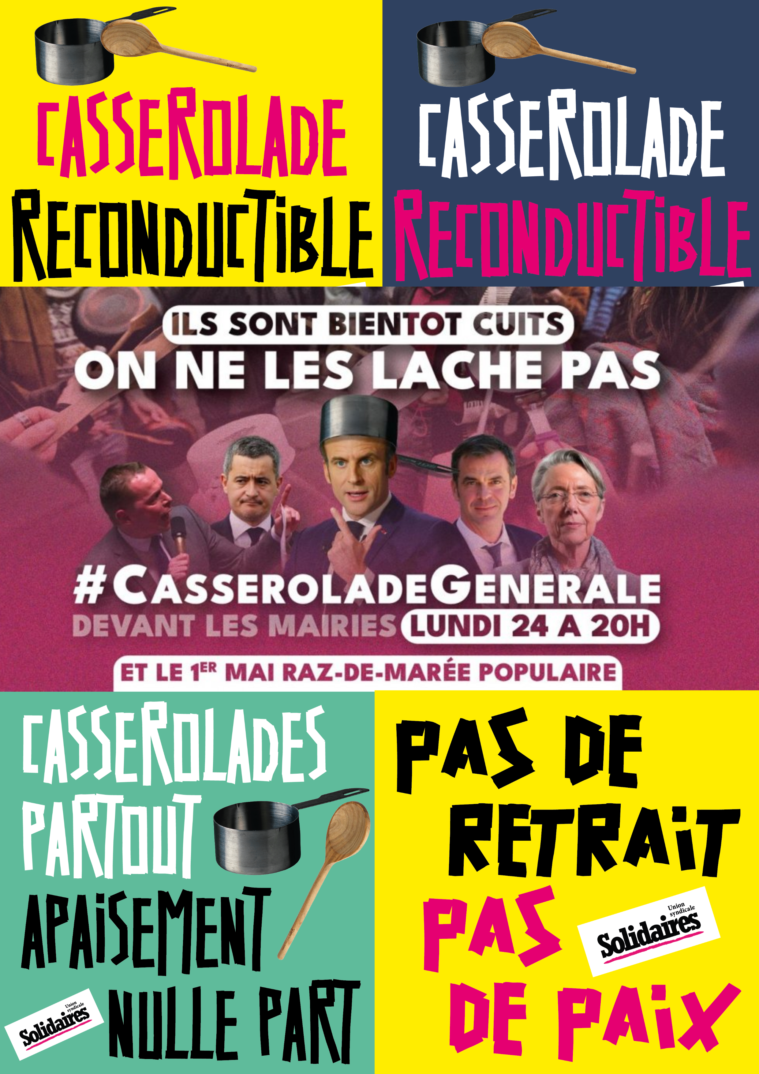 Le principe est simple, les citoyennes et citoyens déterminées à ne pas lâcher pour un meilleur partage des richesses, la réduction du temps de travail et de meilleures conditions de vie pour toustes les travailleureuses, se retrouvent à nouveau ce lundi soir devant leur mairie (ou une mairie de leur choix) avec une casserole et une cuillère pour montrer que le pays n'est pas prêt à l'apaisement tant que le gouvernement ne revient pas sur son passage en force et ne retire pas sa réforme des retraites.