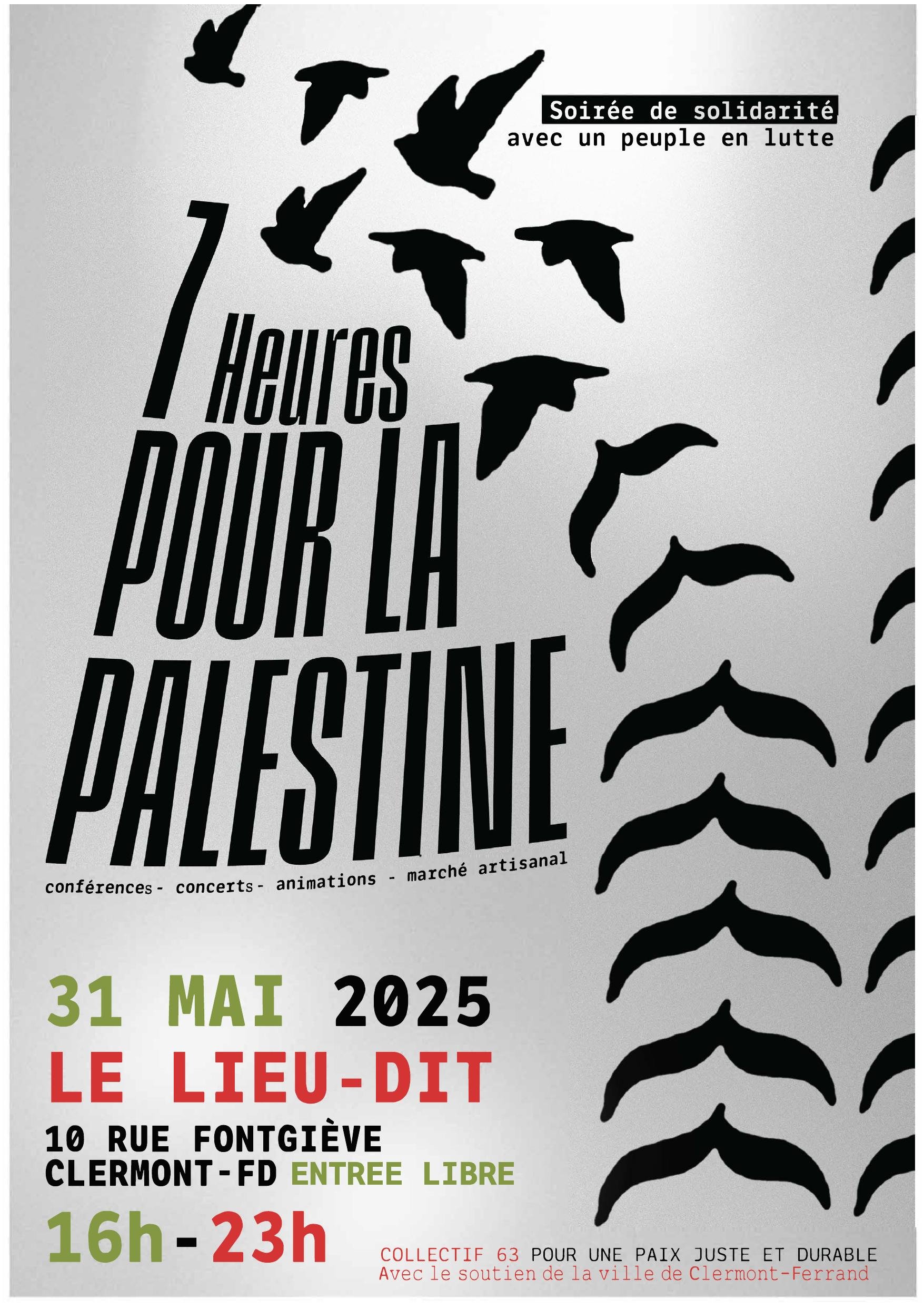 Le Collectif 63 pour une paix juste et durable (33 organisations dans le département du Puy-de-Dôme), mobilisé depuis octobre 2023 en soutien au peuple palestinien et contre le génocide à Gaza, vous invite à venir vous informer, à dialoguer, à partager nos expériences et à manifester notre solidarité lors des « 7 heures pour la Palestine », le 31 mai au Lieu Dit.