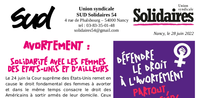 AVORTEMENT : SOLIDARITÉ AVEC LES FEMMES DES ETATS-UNIS ET D’AILLEURS