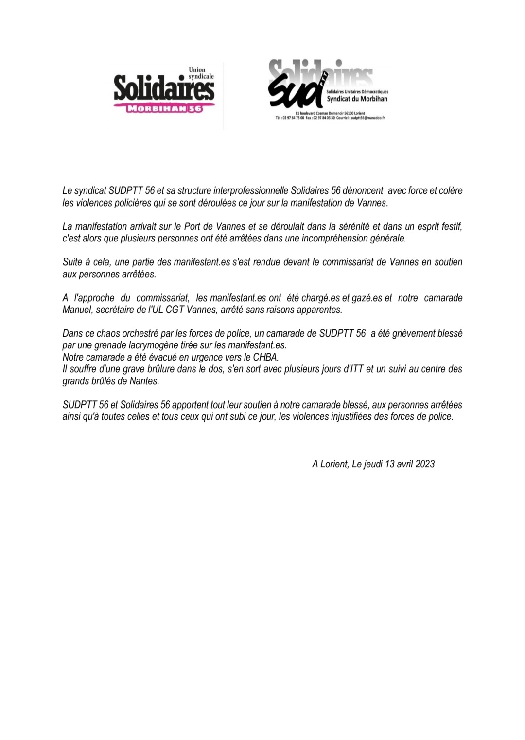 Communiqué Solidaires 56 - Violences policières manifestation de Vannes