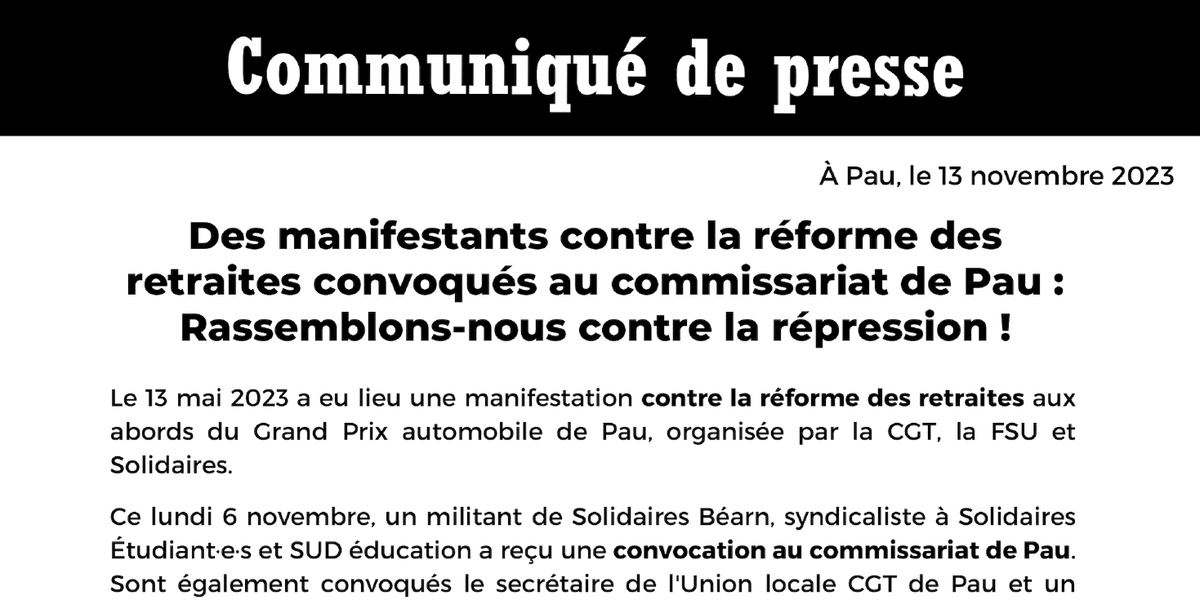• Des manifestants contre la réforme des retraites convoqués au commissariat de Pau : rassemblons-nous contre la répression !