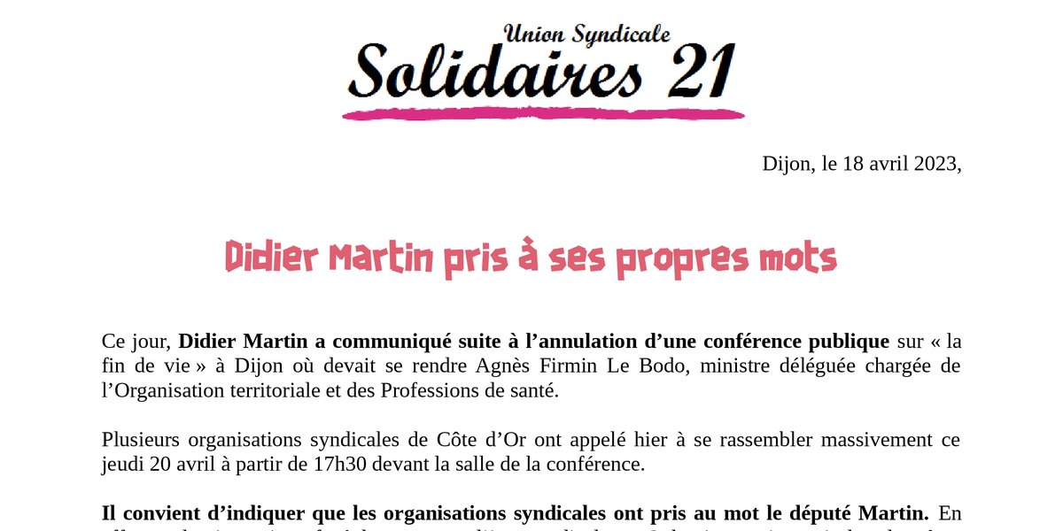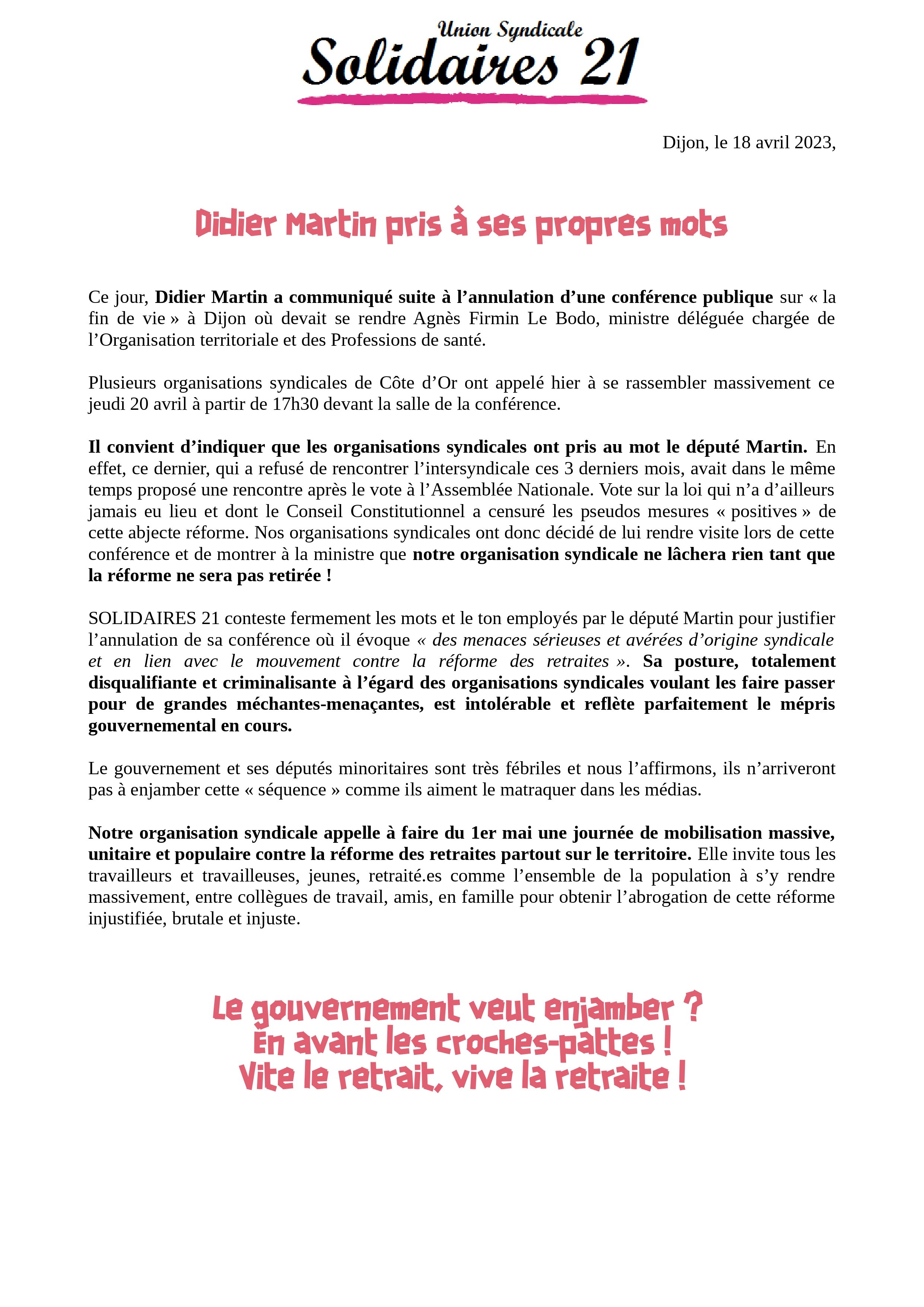 SOLIDAIRES 21 conteste fermement les mots et le ton employés par le député Martin pour justifier l’annulation de sa conférence où il évoque « des menaces sérieuses et avérées d’origine syndicale et en lien avec le mouvement contre la réforme des retraites ». Sa posture, totalement disqualifiante et criminalisante à l’égard des organisations syndicales voulant les faire passer pour de grandes méchantes-menaçantes, est intolérable et reflète parfaitement le mépris gouvernemental en cours.