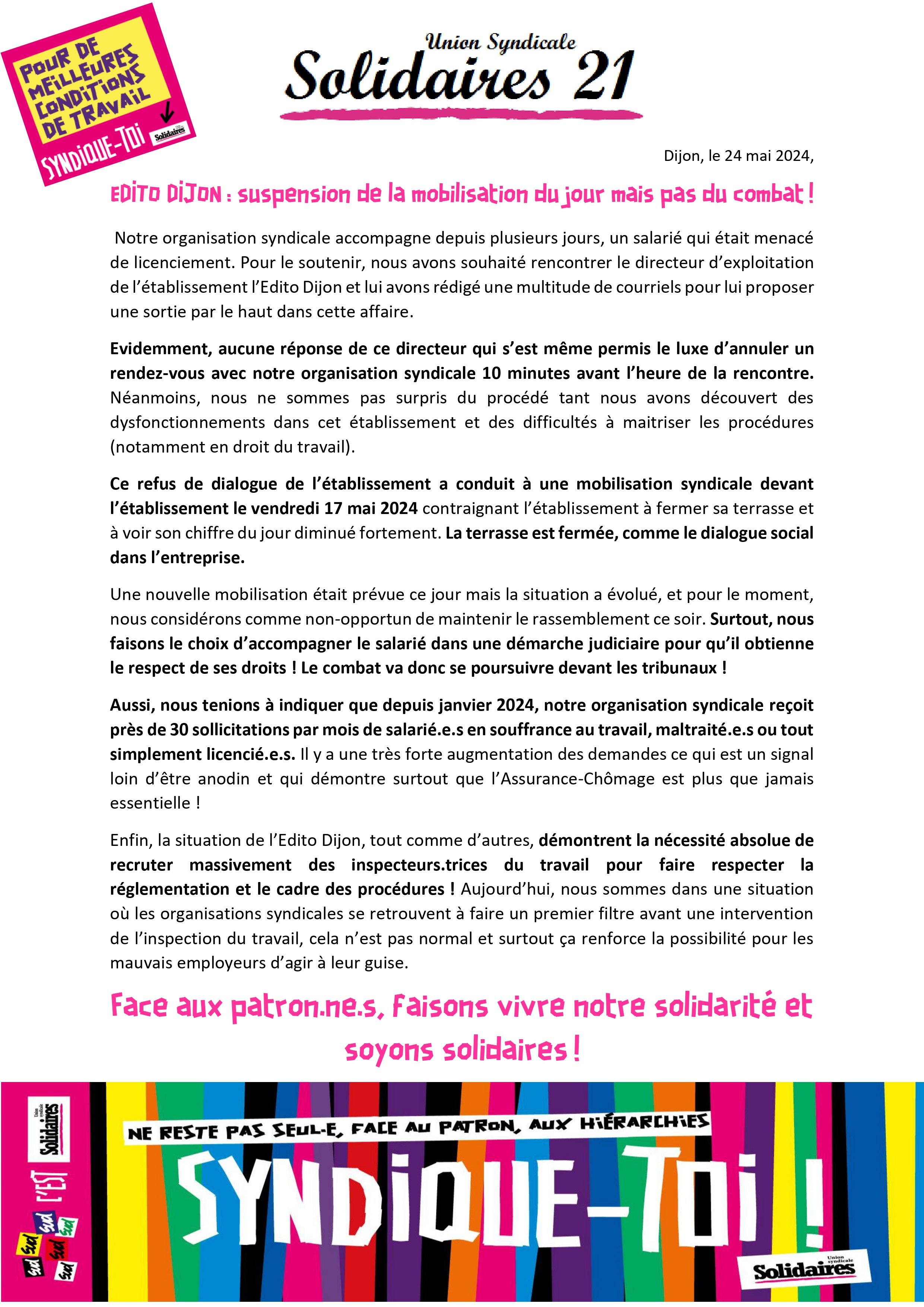 Enfin, la situation de l’Edito Dijon, tout comme d’autres, démontrent la nécessité absolue de recruter massivement des inspecteurs.trices du travail pour faire respecter la réglementation et le cadre des procédures ! Aujourd’hui, nous sommes dans une situation où les organisations syndicales se retrouvent à faire un premier filtre avant une intervention de l’inspection du travail, cela n’est pas normal et surtout ça renforce la possibilité pour les mauvais employeurs d’agir à leur guise.