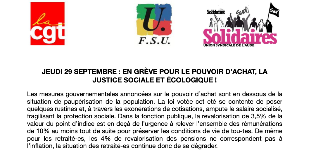 Deux manifestations sont prévues dans l'Aude pour la grève du 29 septembre : 11h Sous Préfecture à Narbonne, 14h30 Portail des Jacobins à Carcassonne