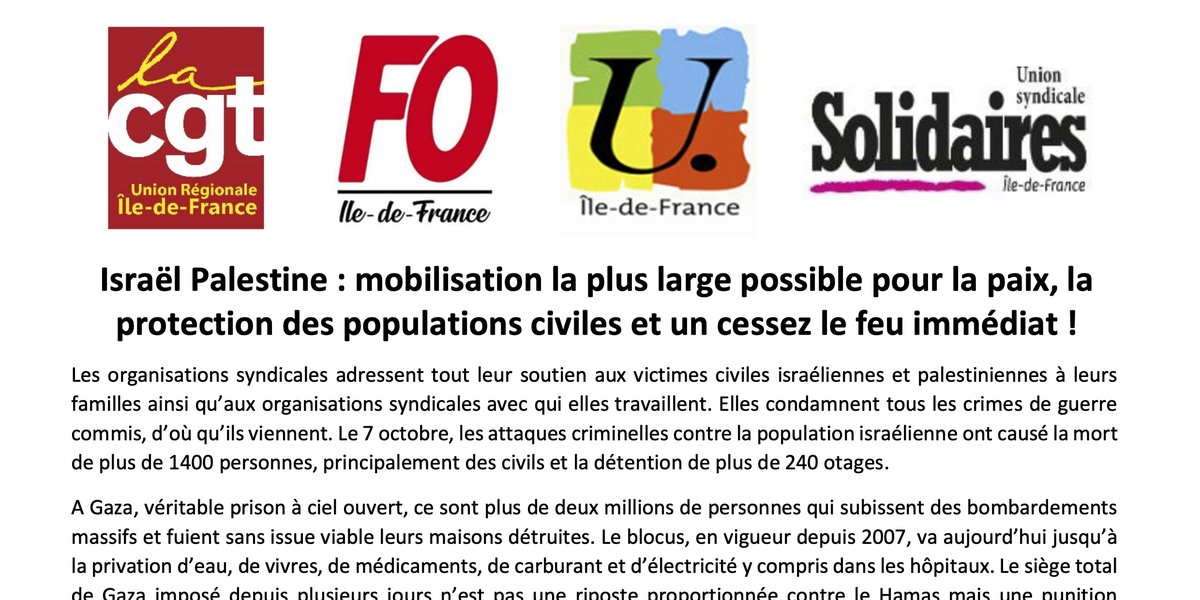 Israël Palestine : mobilisation la plus large possible pour la paix, la protection des populations civiles et un cessez le feu immédiat !