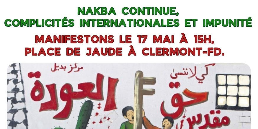 Nakba continue, manifestons le 17 mai à Clermont-Ferrand