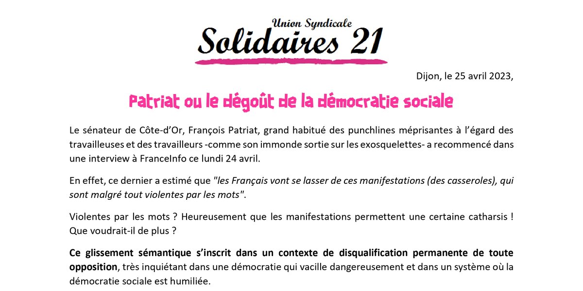 Le sénateur de Côte-d’Or, François Patriat, grand habitué des punchlines méprisantes à l’égard des travailleuses et des travailleurs -comme son immonde sortie sur les exosquelettes- a recommencé dans une interview à FranceInfo ce lundi 24 avril.