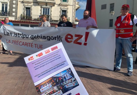 Conférence de presse de présentation du protocole le 27/08/2024 devant le restaurant Le Prado de Saint-Jean-de-Luz, où 4 ans plus tôt trois salarié-es étaient brulé-es au travail, dont un très gravement.
