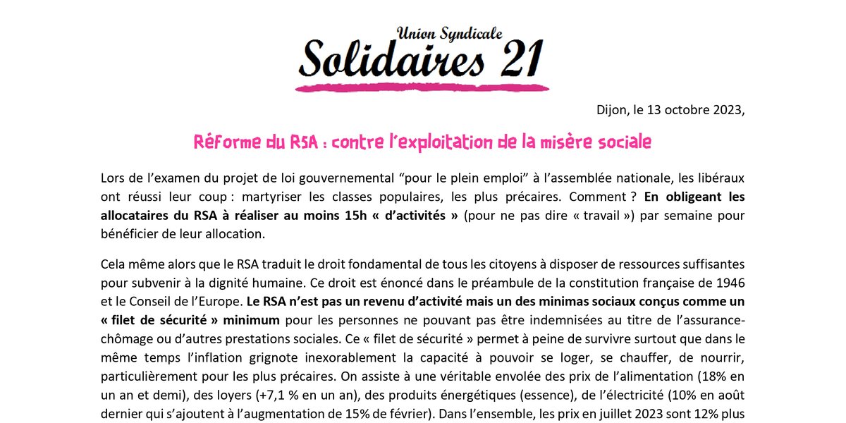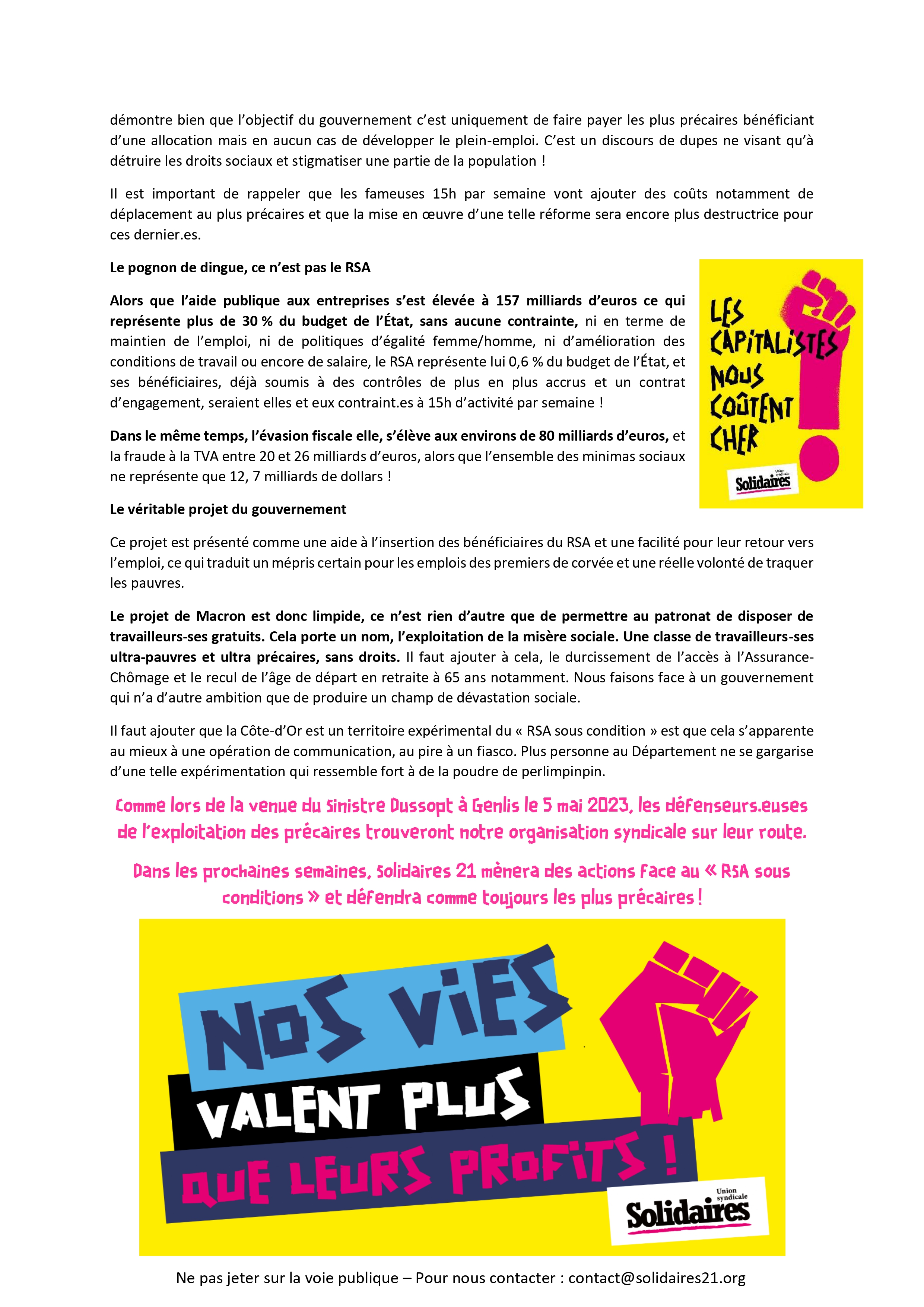 Dans les prochaines semaines, Solidaires 21 mènera des actions face au « RSA sous conditions » et défendra comme toujours les plus précaires !