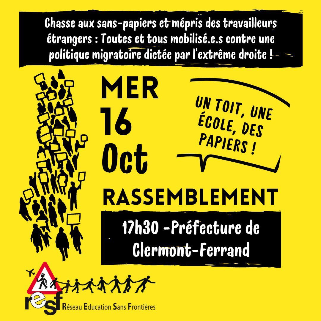 Rassemblons-nous mercredi 16 octobre à 17h30 devant la Préfecture du Puy-de-Dôme pour dénoncer une politique migratoire locale répressive et inique, reflet d’une dérive nationale xénophobe et indigne imposée par l’extrême droite.