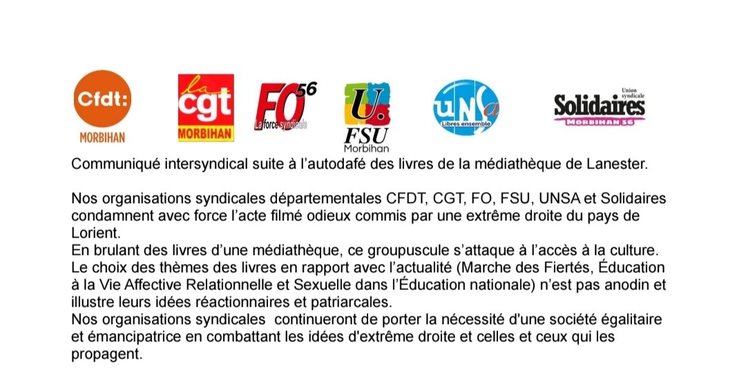 Nos organisations syndicales départementales CFDT, CGT, FO, FSU, UNSA et Solidaires condamnent avec force l’acte filmé odieux commis par une extrême droite du pays de Lorient. En brulant des livres d’une médiathèque, ce groupuscule s’attaque à l’accès à la culture. Le choix des thèmes des livres en rapport avec l’actualité (Marche des Fiertés, Éducation à la Vie Affective Relationnelle et Sexuelle dans l’Éducation nationale) n’est pas anodin et illustre leurs idées réactionnaires et patriarcales. Nos organisations syndicales continueront de porter la nécessité d'une société égalitaire et émancipatrice en combattant les idées d'extrême droite et celles et ceux qui les propagent.