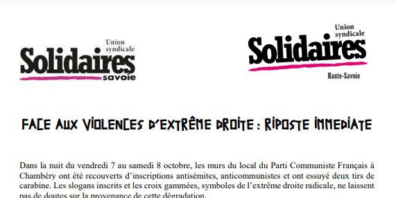 Solidaires 73 et 74 : FACE AUX VIOLENCES D’EXTRÊME DROITE : RIPOSTE IMMEDIATE